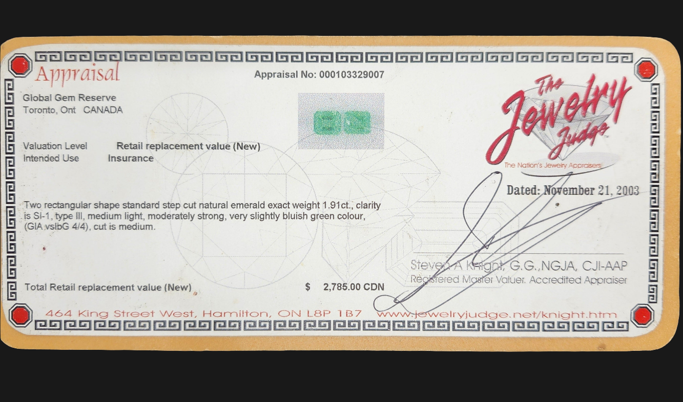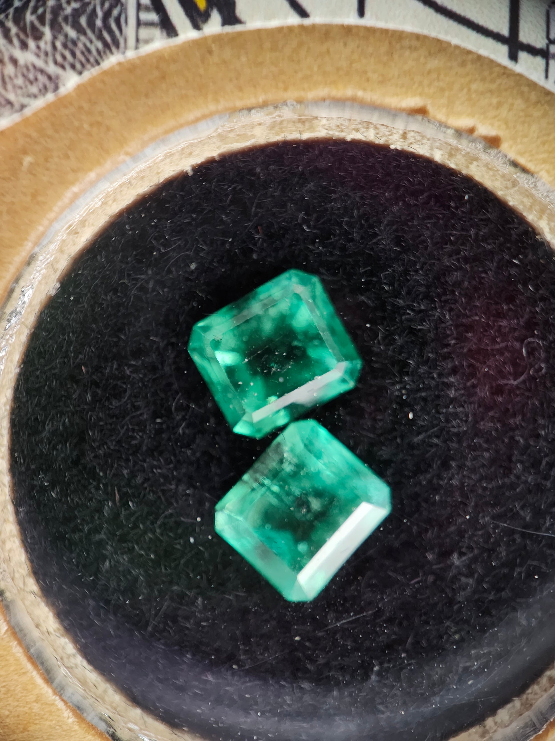 Ce lot exclusif de deux émeraudes naturelles certifiées GRA est présenté dans un emballage scellé, garantissant leur authenticité et leur qualité. La couleur est VSLBG Very Slightly Bluish Green, un vert légèrement bleuté, d'une très belle intensité recherchée. Chaque pierre, taillée en Step Cut rectangulaire standard , affiche un poids total de 1,91 ct et a été soigneusement sélectionnée pour l'éclat de sa couleur et la finesse de sa clarté.